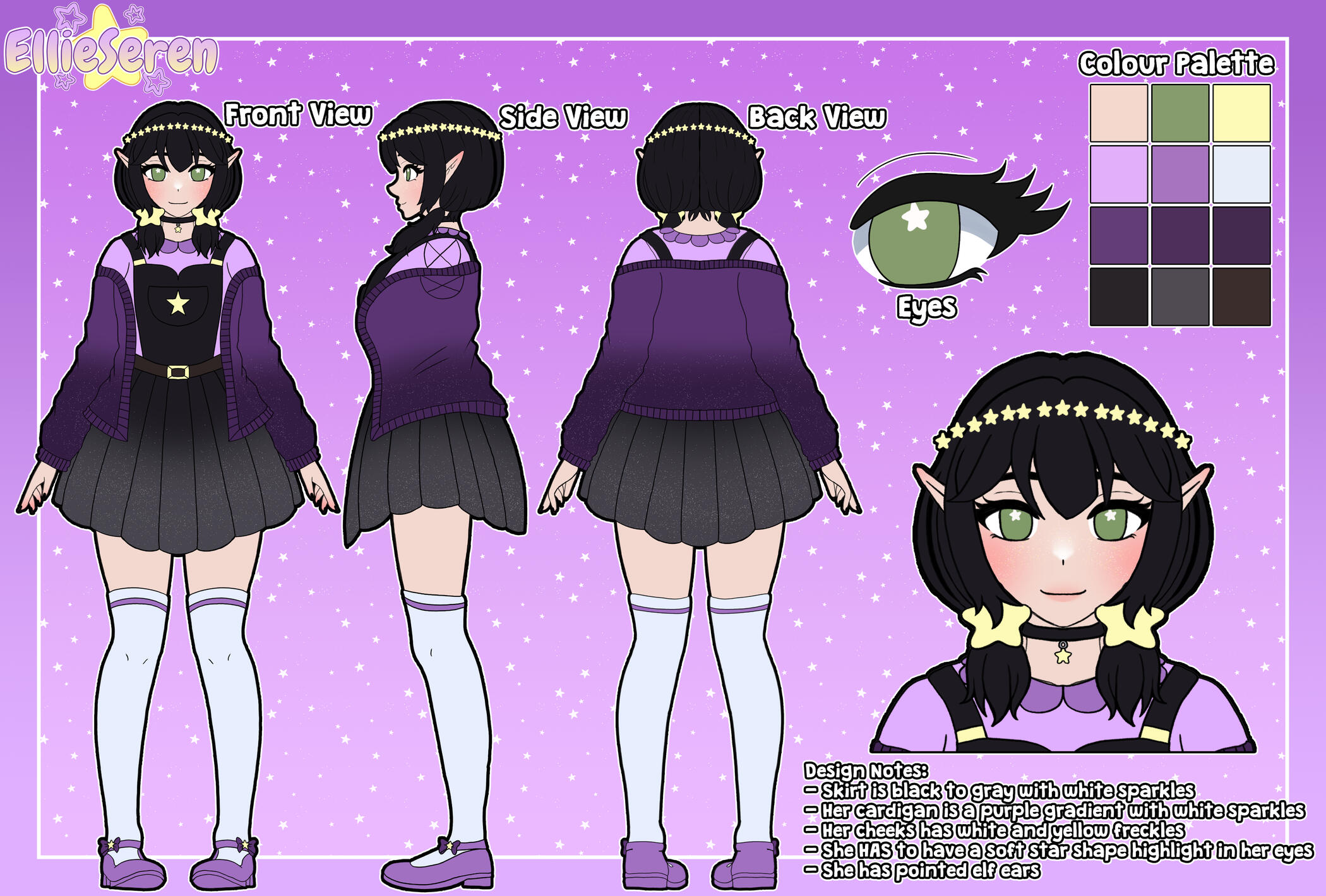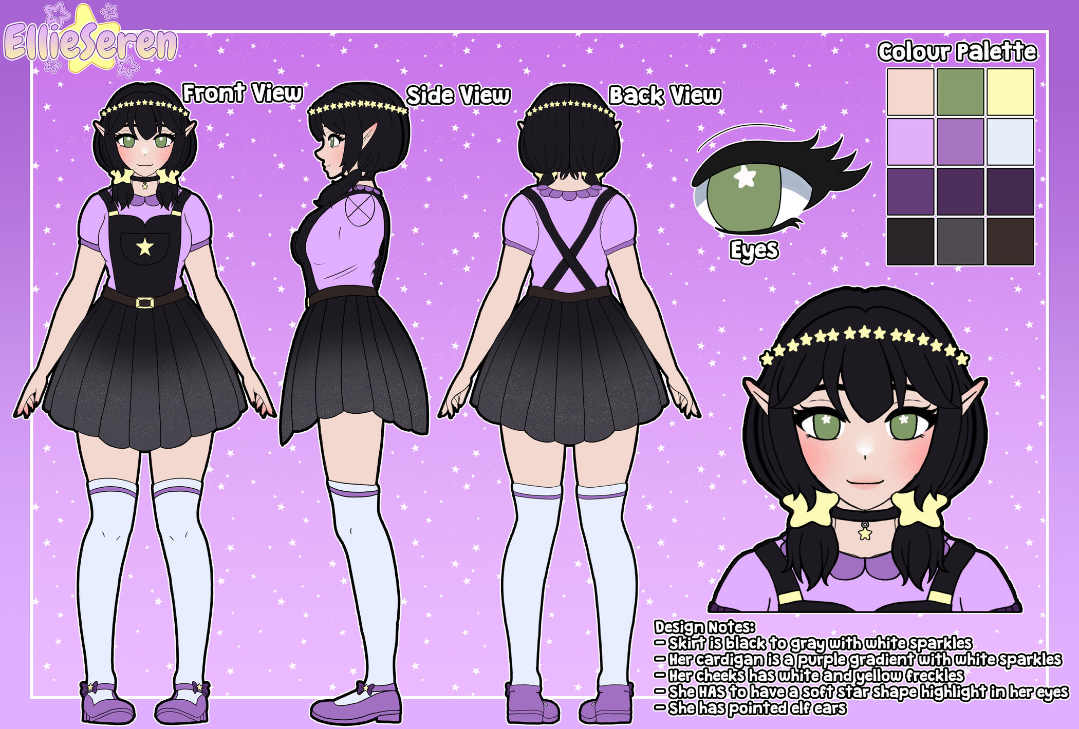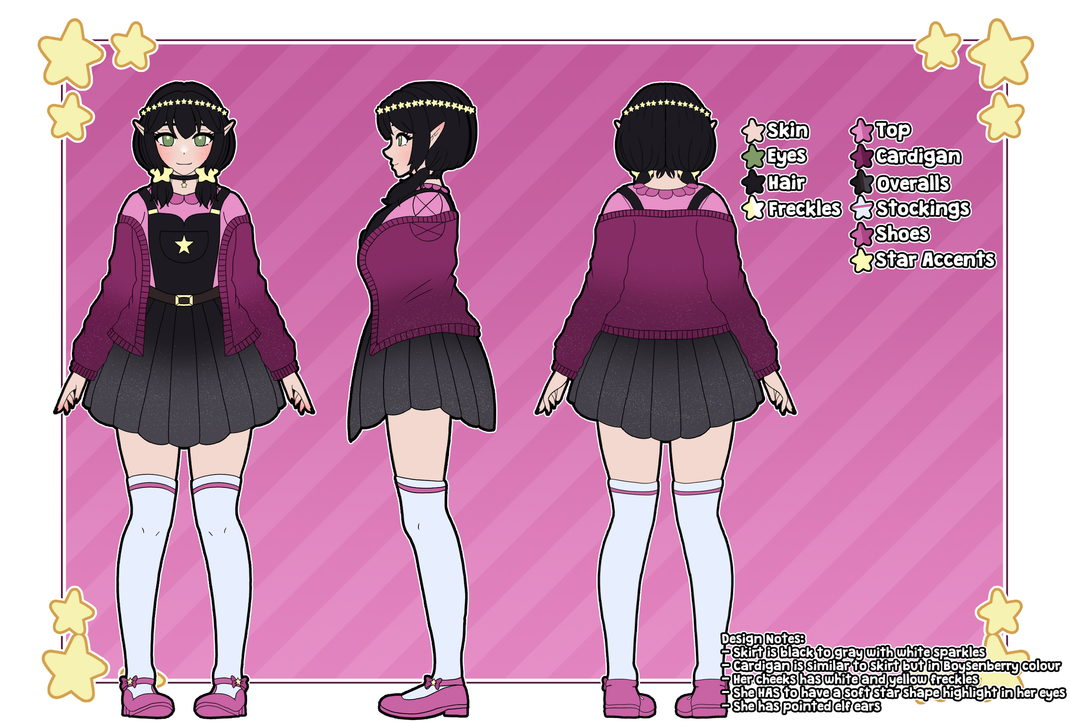 EllieSeren is a Starmaiden. Starmaidens are a species of Cosmic beings sworn to the protection and care of the stars and planets.She goes by Ellie for short, but also doesn't mind being called Seren.Ellie is the youngest of her pod, being the youngest of six starlings. She is in her 20s. She is classed as a young adult to Starmaidens.She was tasked to watch over Earth, being sent to reside in Wales. From there she decided to live amongst the humans and become a VStreamer and Artist.She has shapeshifting abilities, she can change her appearance if she chooses. She prefers to stick to her true form but can change to anything. She often likes to become a kenonomimi, a human and a demon.